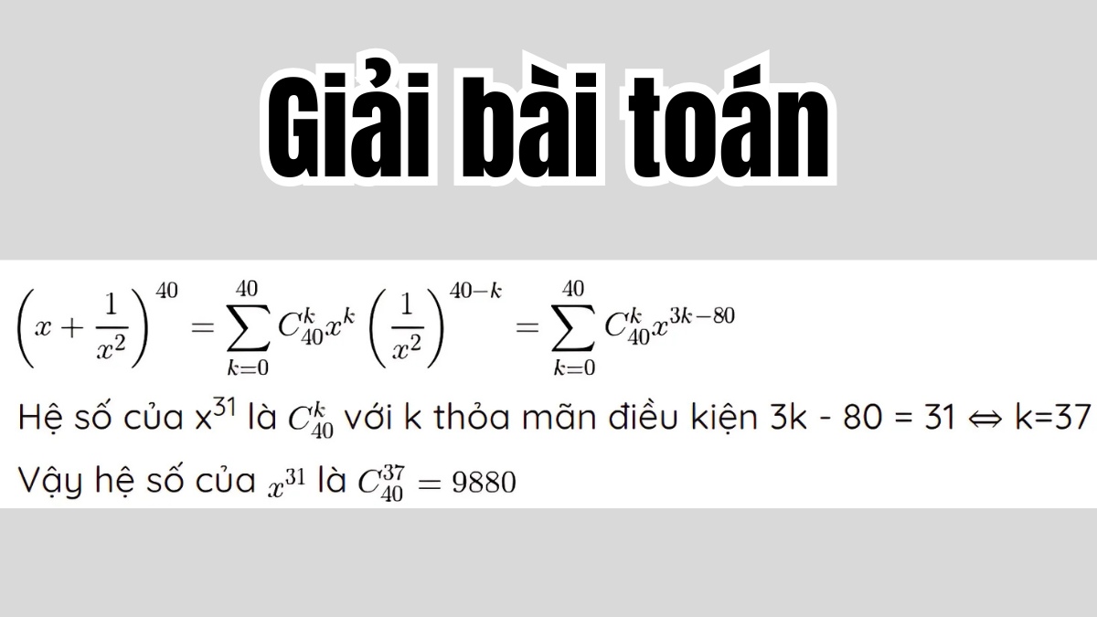 Trong đó, C(n,k)=n!/(k!(n−k)!)C(n, k) = n! / (k!(n-k)!) là hệ số tổ hợp, cho biết số cách chọn kk phần tử từ nn phần tử khác nhau.